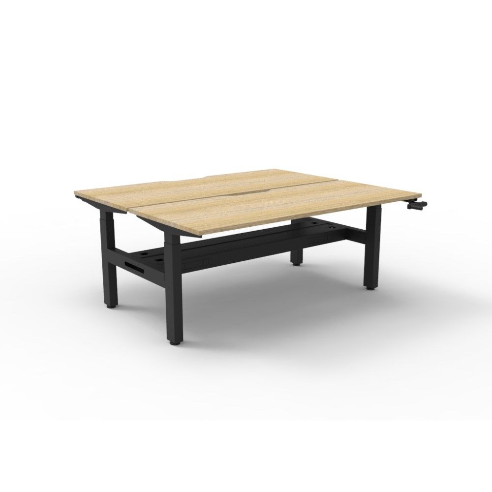• Rapidline Boost back to back 2 person manual crank height adjustable workstation with cable tray. Oak top with black frame.