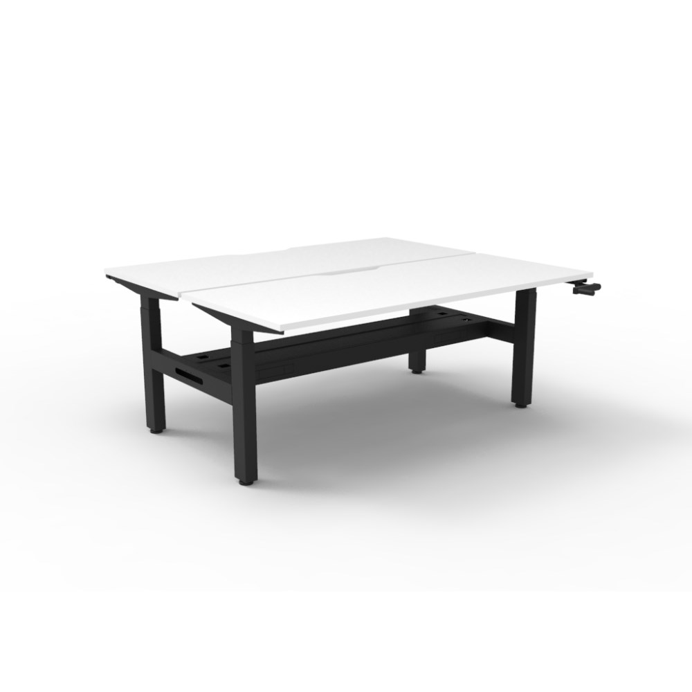 • Rapidline Boost back to back 2 person manual crank height adjustable workstation with cable tray. White top with black frame.