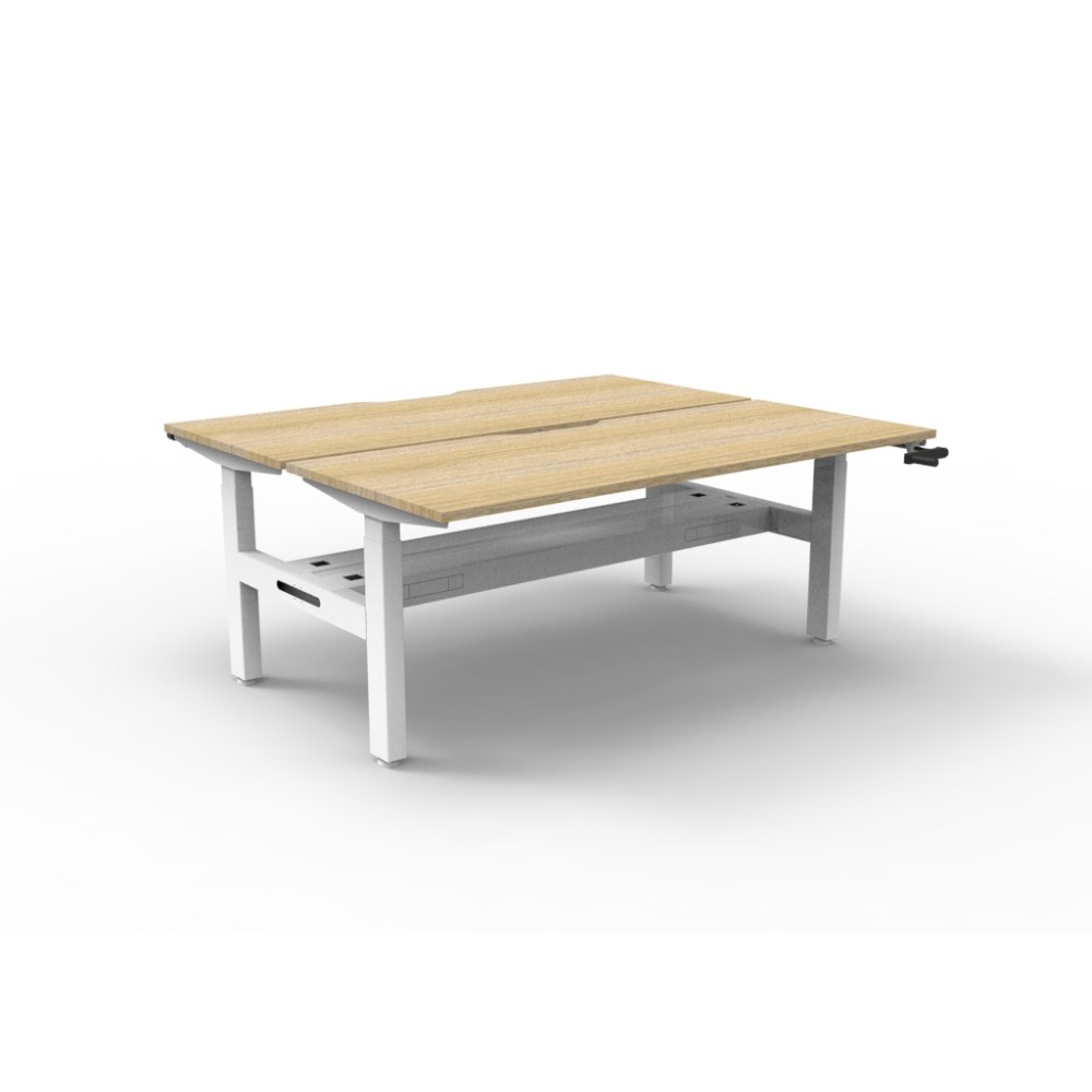 • Rapidline Boost back to back 2 person manual crank height adjustable workstation with cable tray. Oak top with white frame.