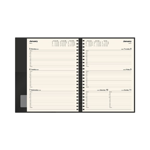 • Pen loop, lay flat opening, ribbon marker and week to view layout.