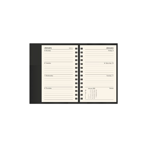 • Pen loop, lay flat opening, ribbon marker and week to view layout.