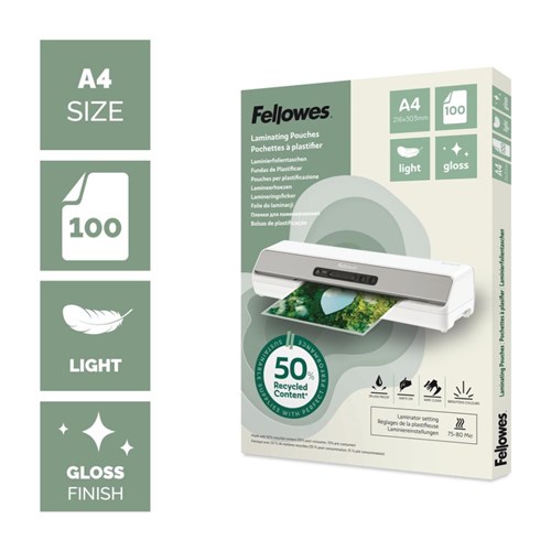 Fellowes Sustainable Laminating Pouches A4 75/80 Micron Gloss Pack Of 100