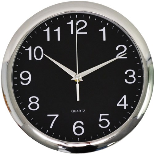 Italplast Wall Clock 30cm Round With Large Numbers Chrome Frame Black Face