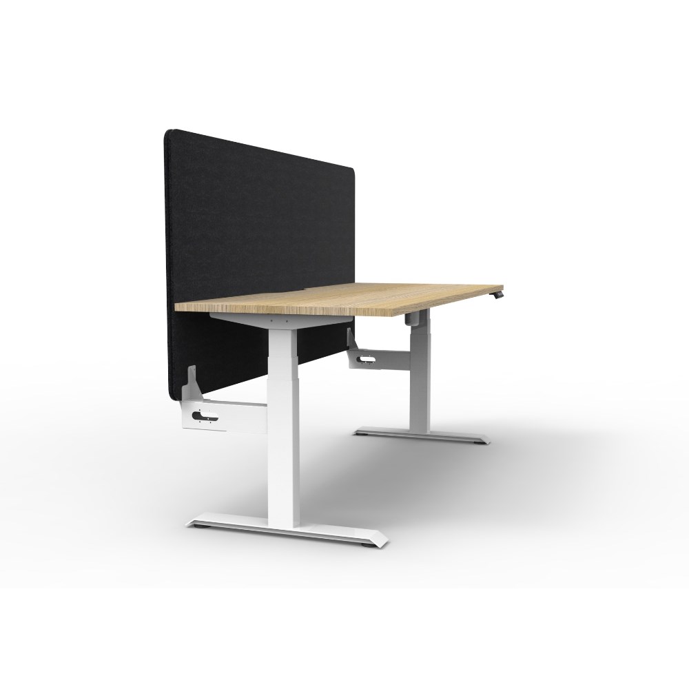 • Electric height adjustable single sided workstation with Natural Oak top and White Satin frame, Black Eco screen.