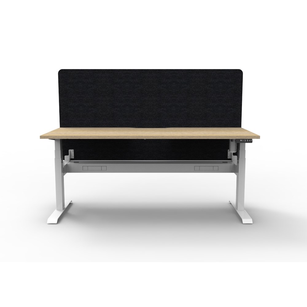 • Electric height adjustable single sided workstation with Natural Oak top and White Satin frame, Black Eco screen and cable tray.