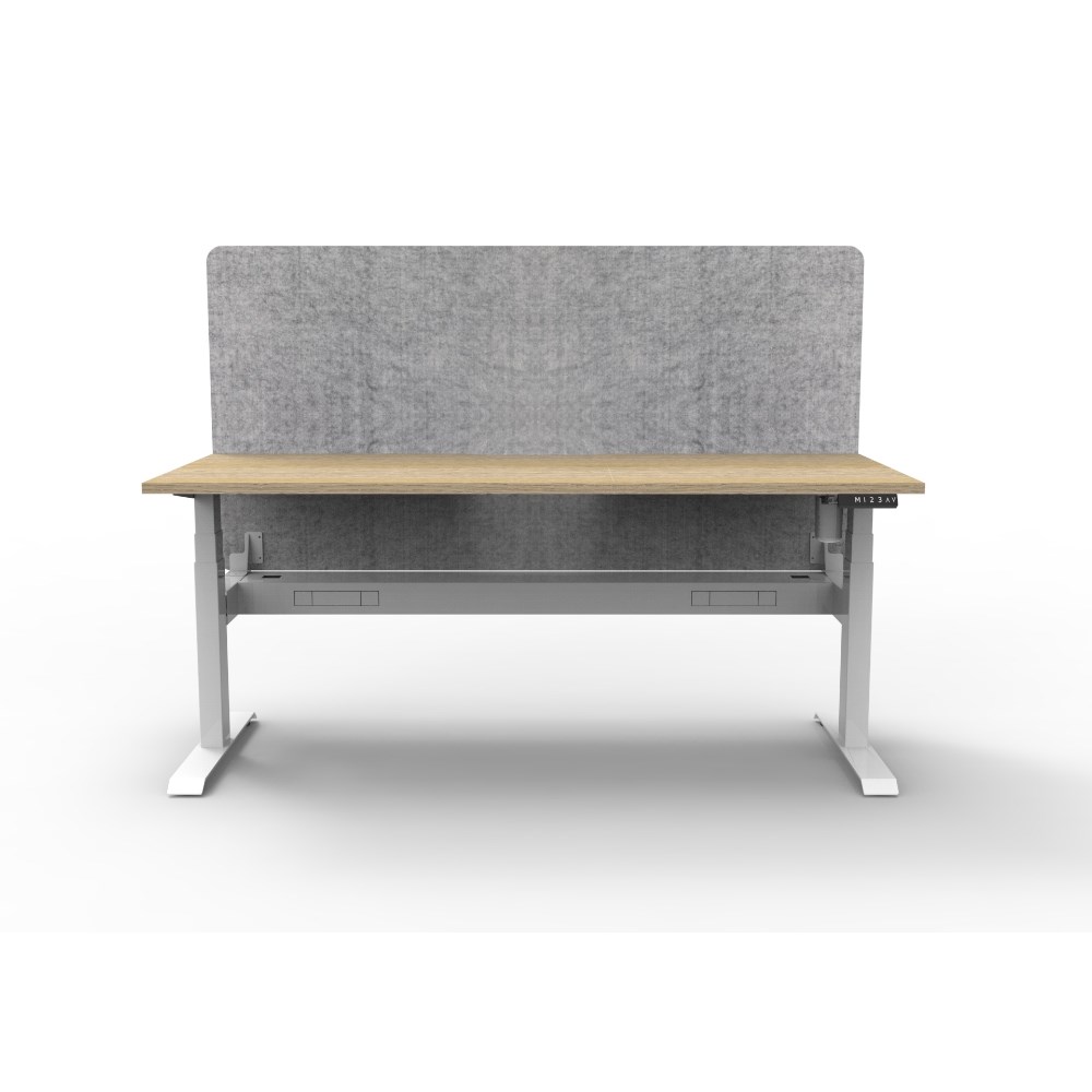 • Electric height adjustable single sided workstation with Natural Oak top and White Satin frame, Grey Eco screen and cable tray.