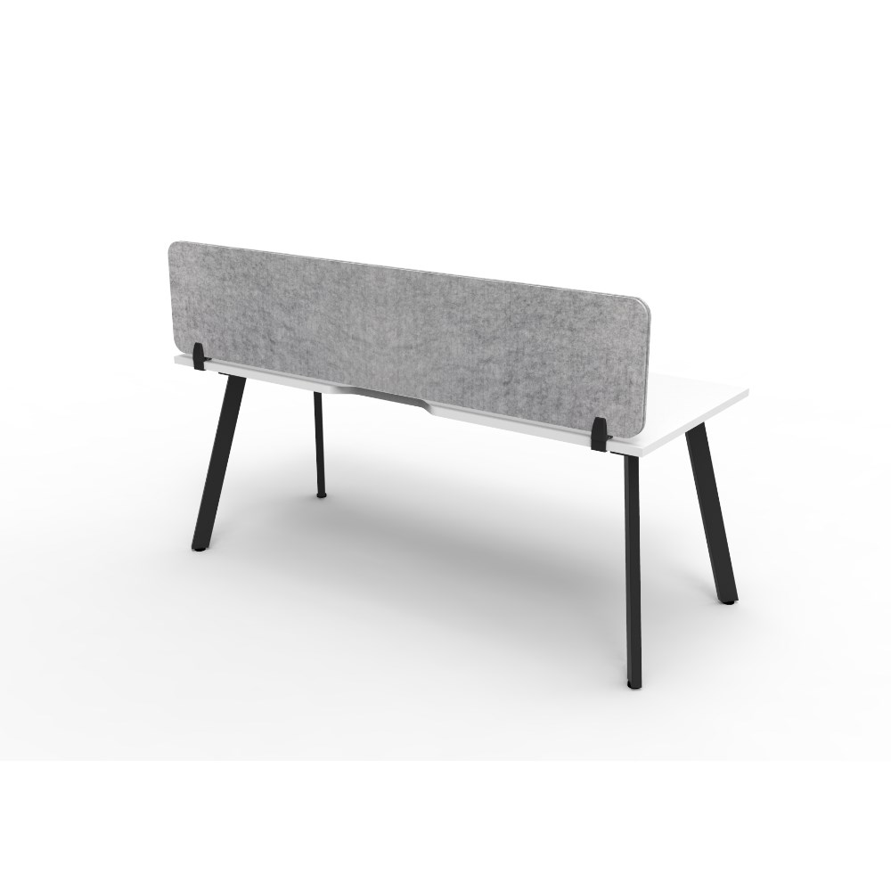 • Natural White worksurface with rigid edging and 410mmW x 50mmD scallop cable access. Black Satin powder coat frame. Eco screen.