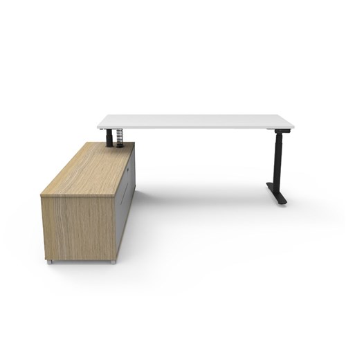 • Natural White top and Black Satin frame. Height adjustable desk with left hand side cabinet.