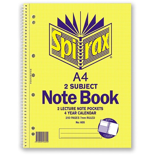Spirax 605 2 Subject Notebook Perforated/Note Pockets A4 Ruled 250 Page Side Opening