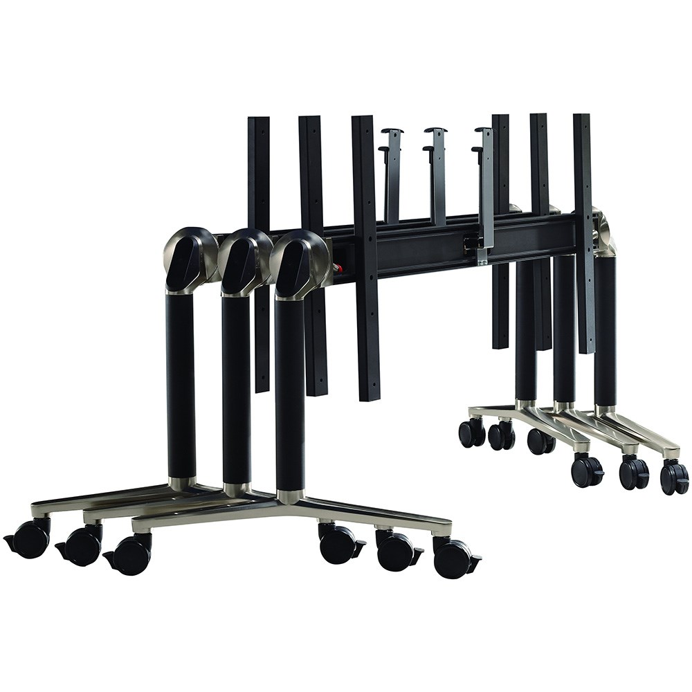 • As the table top is elevated the legs splay out, reducing depth and allowing the tables to stack straight on for storage, rather than offset on a diagonal.